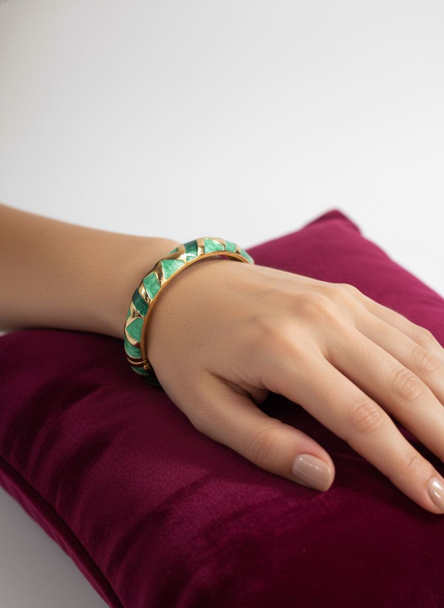 A Meenakari Kada is a beautifully crafted traditional bangle adorned with intricate enamel work. Known for its vibrant colors and detailed designs, it combines artistry with elegance, making it a timeless accessory for festive and cultural occasions