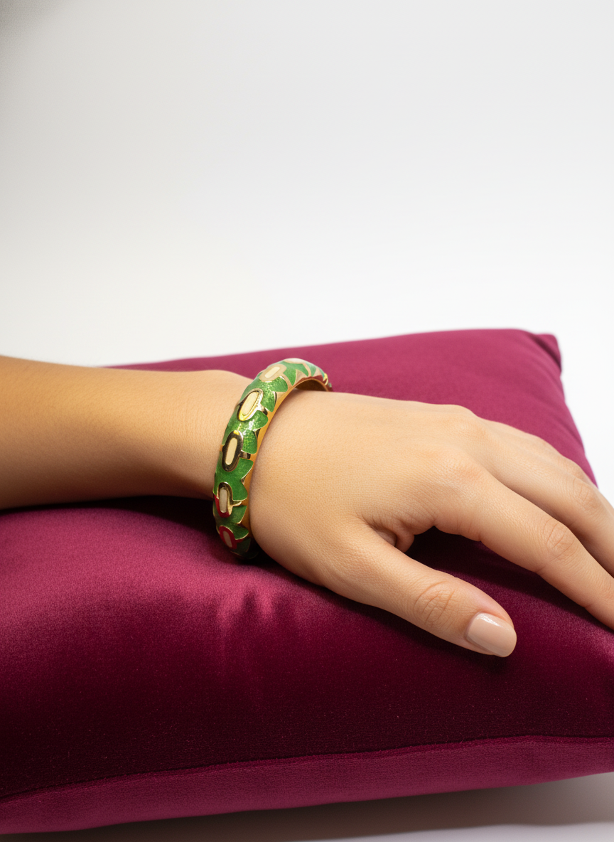 A Meenakari Kada is a beautifully crafted traditional bangle adorned with intricate enamel work. Known for its vibrant colors and detailed designs, it combines artistry with elegance, making it a timeless accessory for festive and cultural occasions